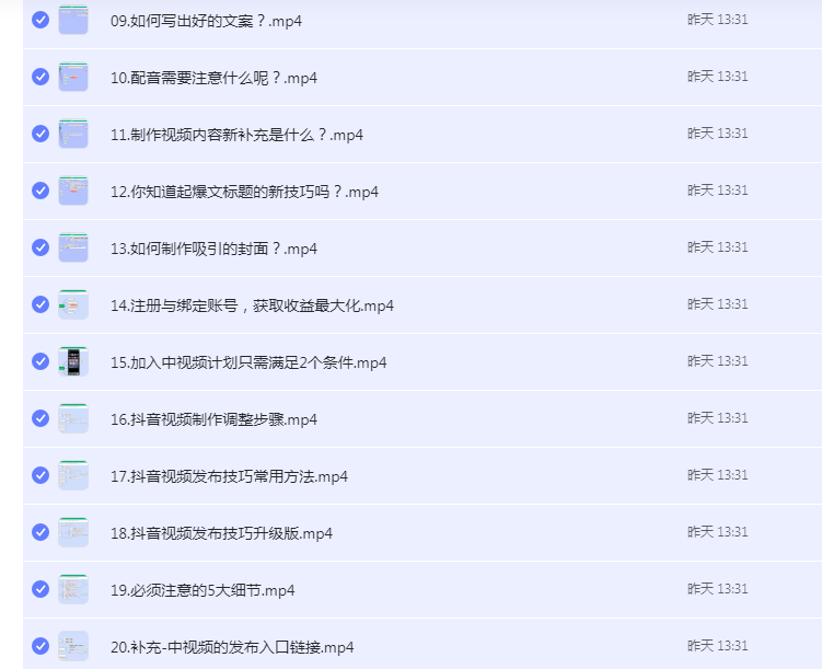 课程来自星哥的抖音中视频计划,价值6980元。是今天自媒体的最大风口,单号月入3万抖音中视频项目,不可错过的暴富风口,和猎人电商一样的课程,所谓“中视频”,是基于抖音、快手短视频和优爱腾长视频提出的视频概念,指的是时长为1分钟至30分钟的视频内容,星哥说过,赚钱一定要透过现象看到背后的利益本质,任何项目不是为了做而做,像很多朋友,有基础的老学员也好,没有接触过自媒体的新手也好,都在问星哥这个项目的情况,中视频是百分百可以赚钱,百分百的风口项目。